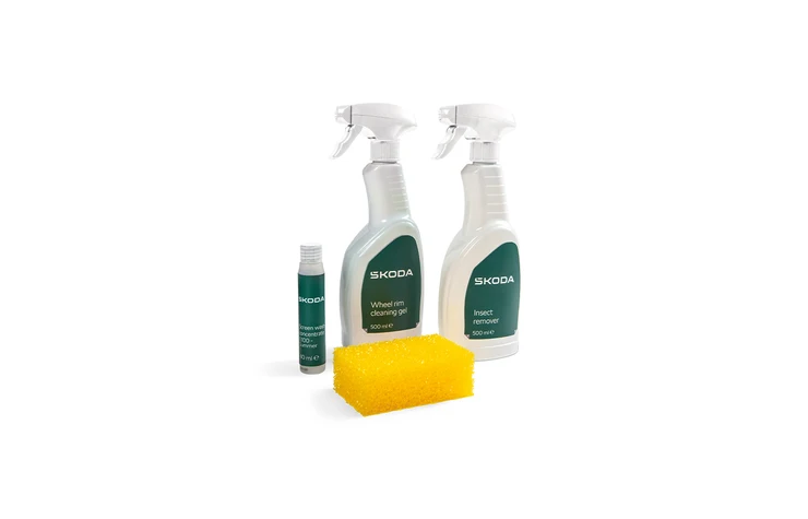 Bestehend aus Scheibenreiniger-Konzentrat (40 ml), Felgenreiniger-Gel (500 ml), Insektenentferner (500 ml), Schwamm zur Insektenentfernung.